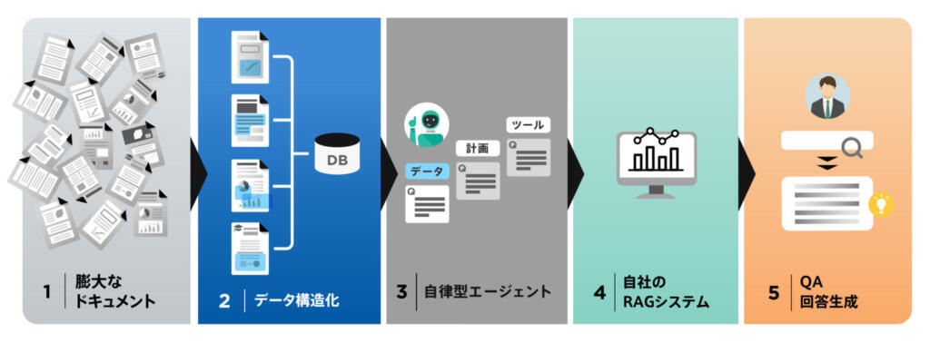 複数の問いが組み合わされた質問に対し「Agent」が最適な手順を自ら思考し、問いを分解。必要な情報を段階的に検索して処理することで、的確な回答を生成します。
