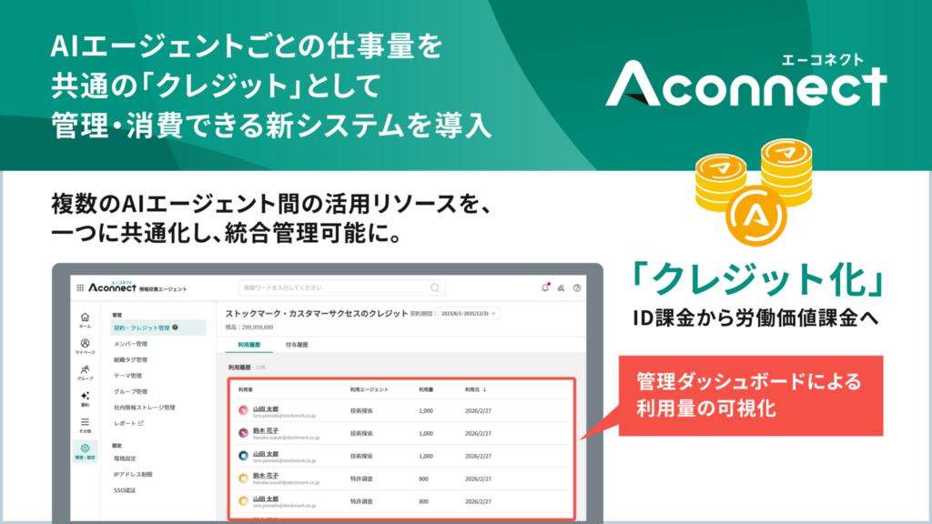 国産生成AI基盤の独自開発や生成AIサービスを提供するストックマーク株式会社(本社:東京都港区、代表取締役CEO:林 達、以下:当社)が提供する製造業向けAIエージェント「Aconnect」は 、技術探索エージェント・特許調査エージェントそれぞれの仕事量を共通の「クレジット」として管理・消費できる新システムを導入したことをお知らせいたします。