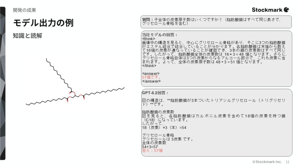 複雑な化学構造式から脂質の炭素原子数を特定するタスクにおいて、フロンティアモデル(GPT-5.2)が誤読する中、本モデルは構造式の細部と専門知識を正確に組み合わせて正解を導き出します。