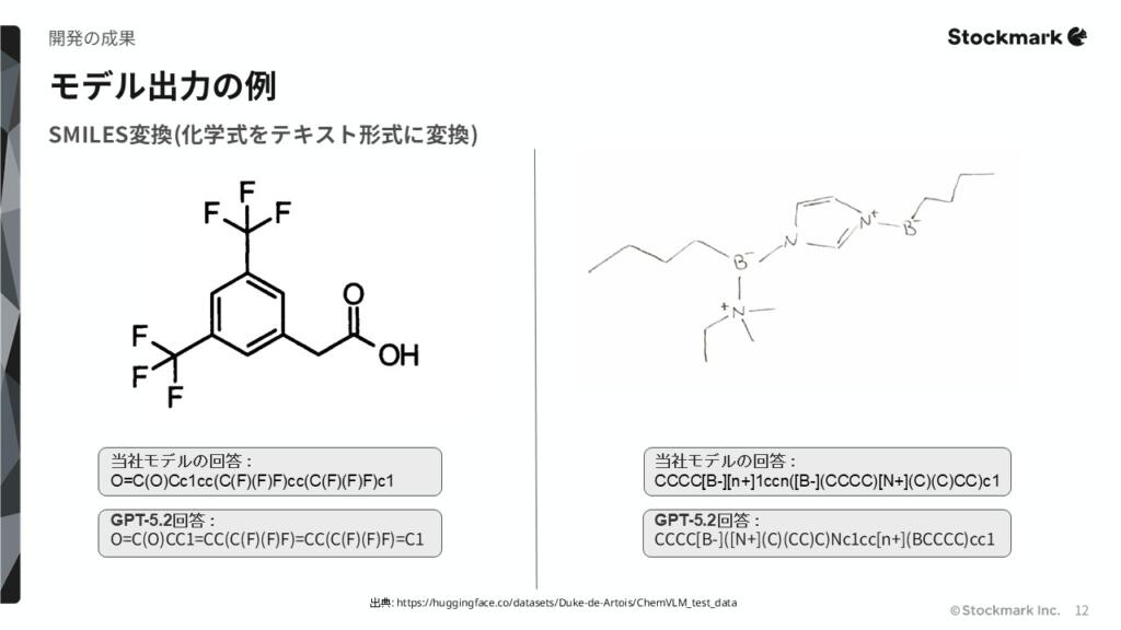化学構造式をテキスト形式の符号(SMILES)へ変換する際、手書きを含む複雑な図面からでも正確な符号化を実現。フロンティアモデルを凌駕する精度で技術資産のデータベース化を支援します。
